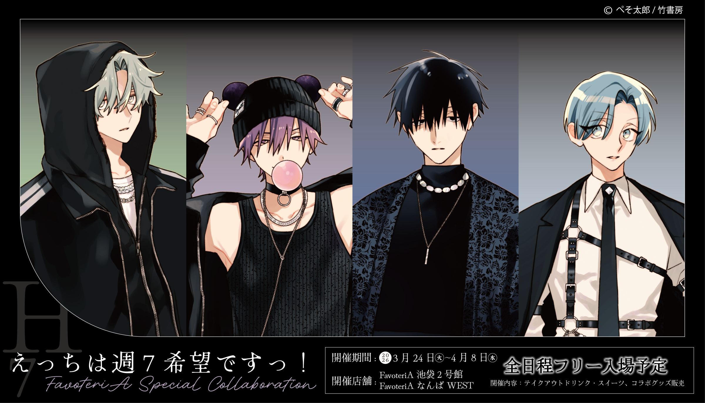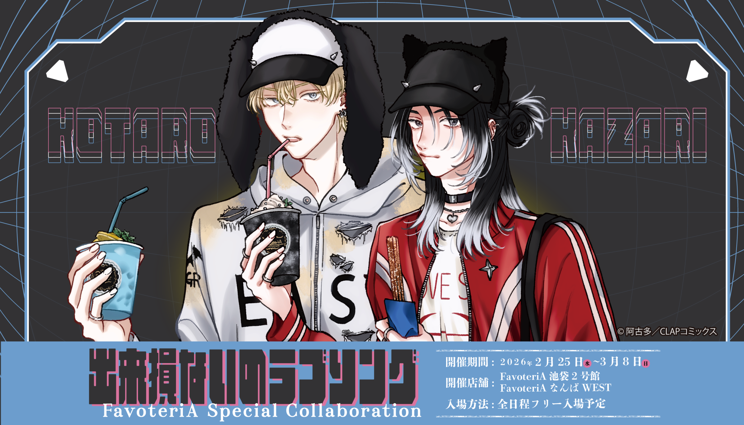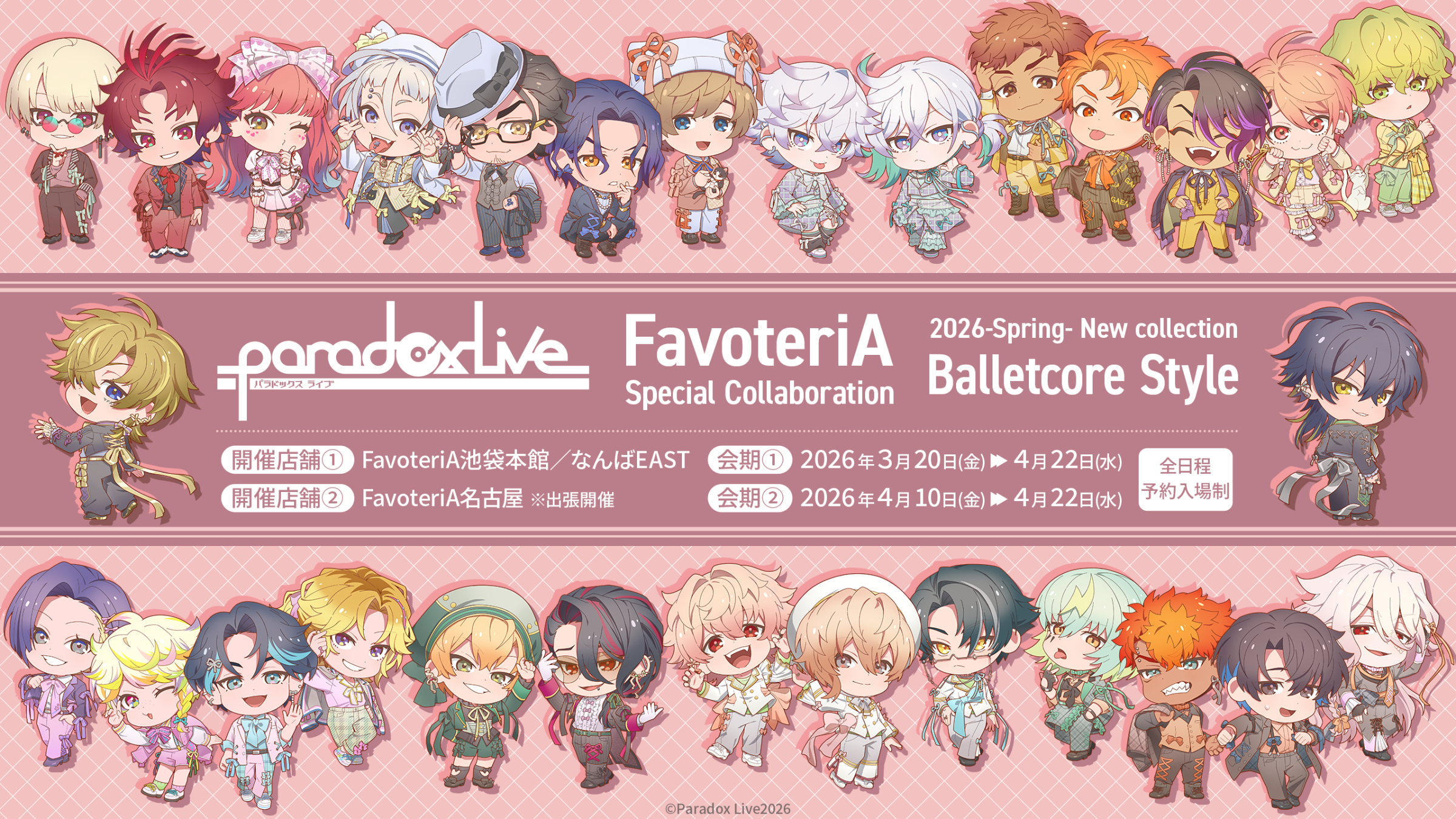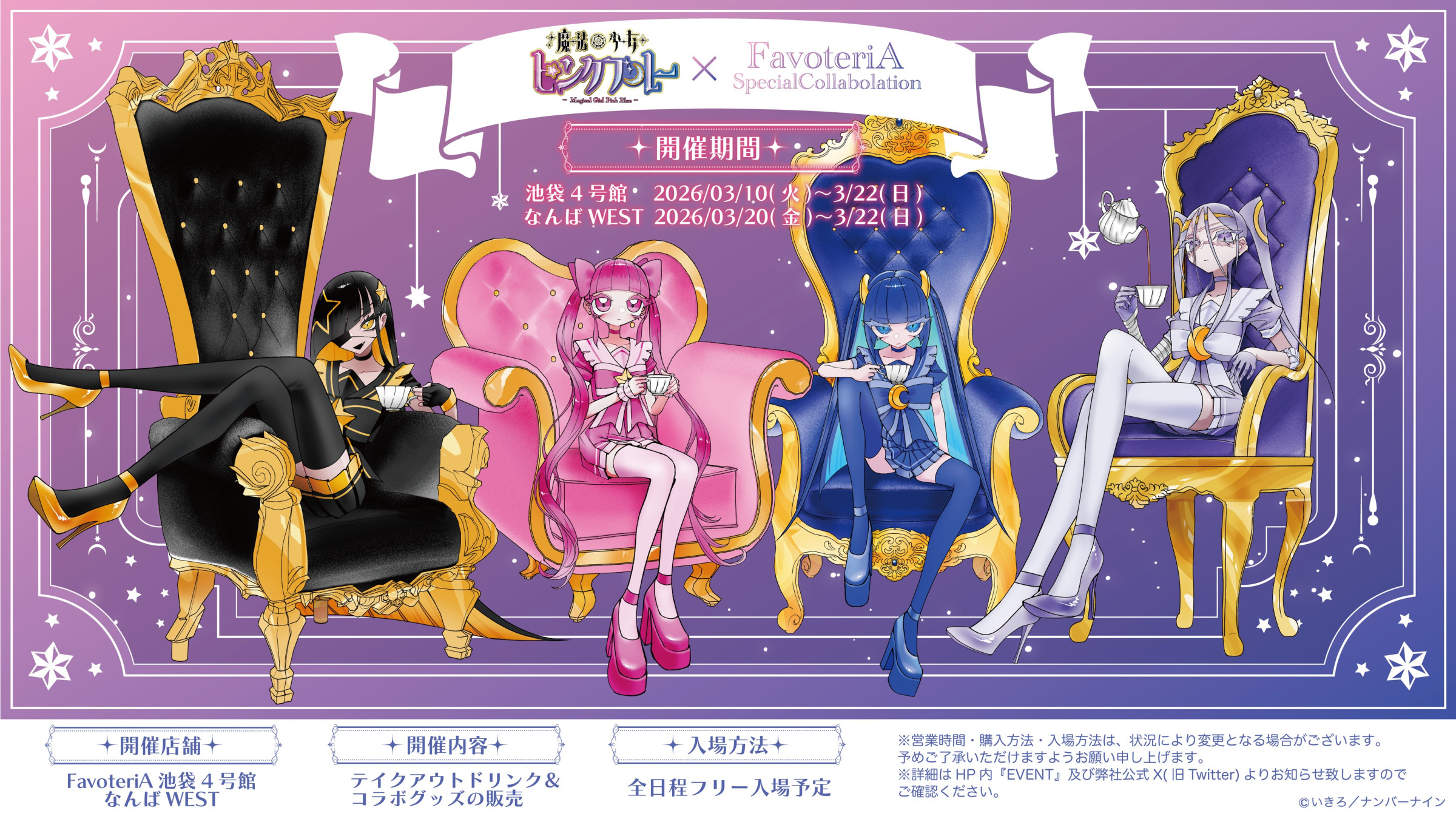 | 営業時間 | 【池袋本館】 12:00〜20:00(ドリンクL.O 19:45) 【池袋2号館】 12:00〜20:00(ドリンクL.O 19:45) 【池袋3号館】 12:00〜20:00 【池袋4号館】※2026年2月OPEN予定 後日更新予定 【なんばWEST】 12:00〜20:00(ドリンクL.O 19:45) 【なんばEAST】 12:00〜20:00(ドリンクL.O 19:45) ※事前にご予約されてのご来店の方は『20:00』までドリンク・グッズ購入可能です。 ※【ドリンクチケット】のご利用は『19:45』までです。ご注意下さい。 |