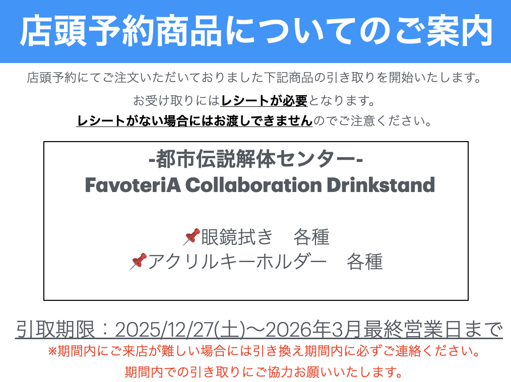 ・店舗で販売する取扱商品の在庫には限りがございます。売り切れの際はご容赦下さい。