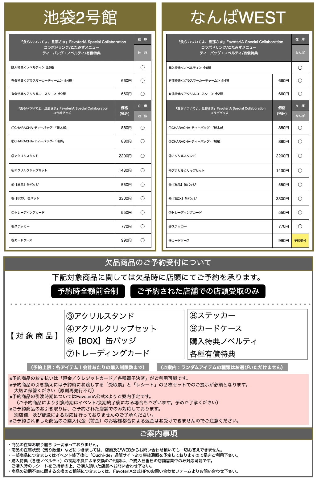 ・その他、店舗ご利用に関するご案内についてはFavoteriA公式Xより発信しておりますので合わせてご確認お願いします。