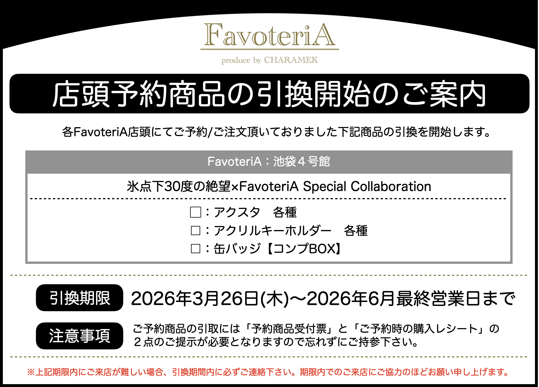 ・その他、店舗ご利用に関するご案内についてはFavoteriA公式Xより発信しておりますので合わせてご確認お願いします。