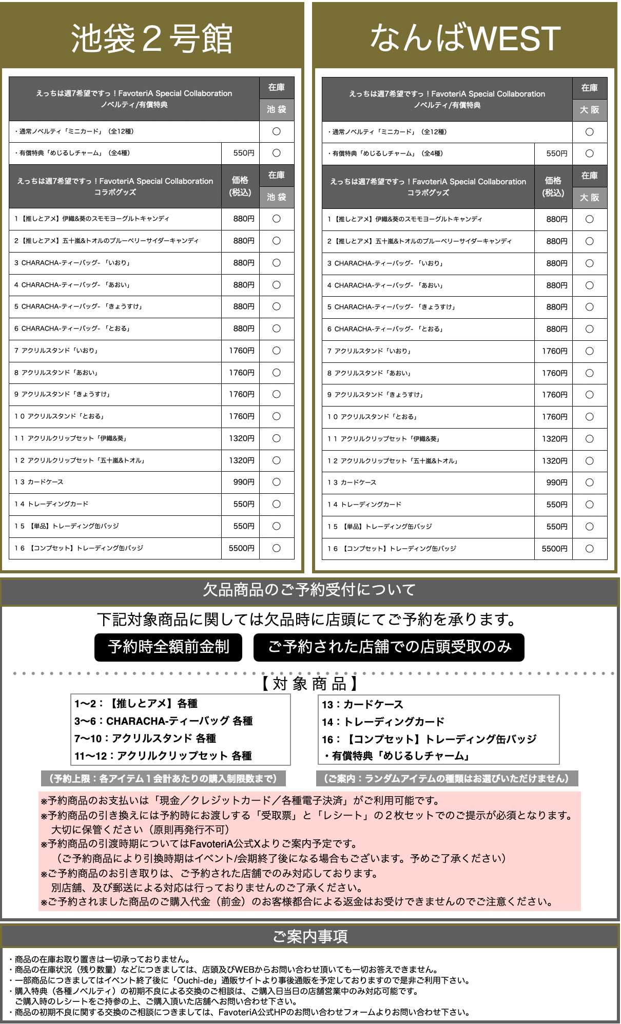 ・その他、店舗ご利用に関するご案内についてはFavoteriA公式Xより発信しておりますので合わせてご確認お願いします。