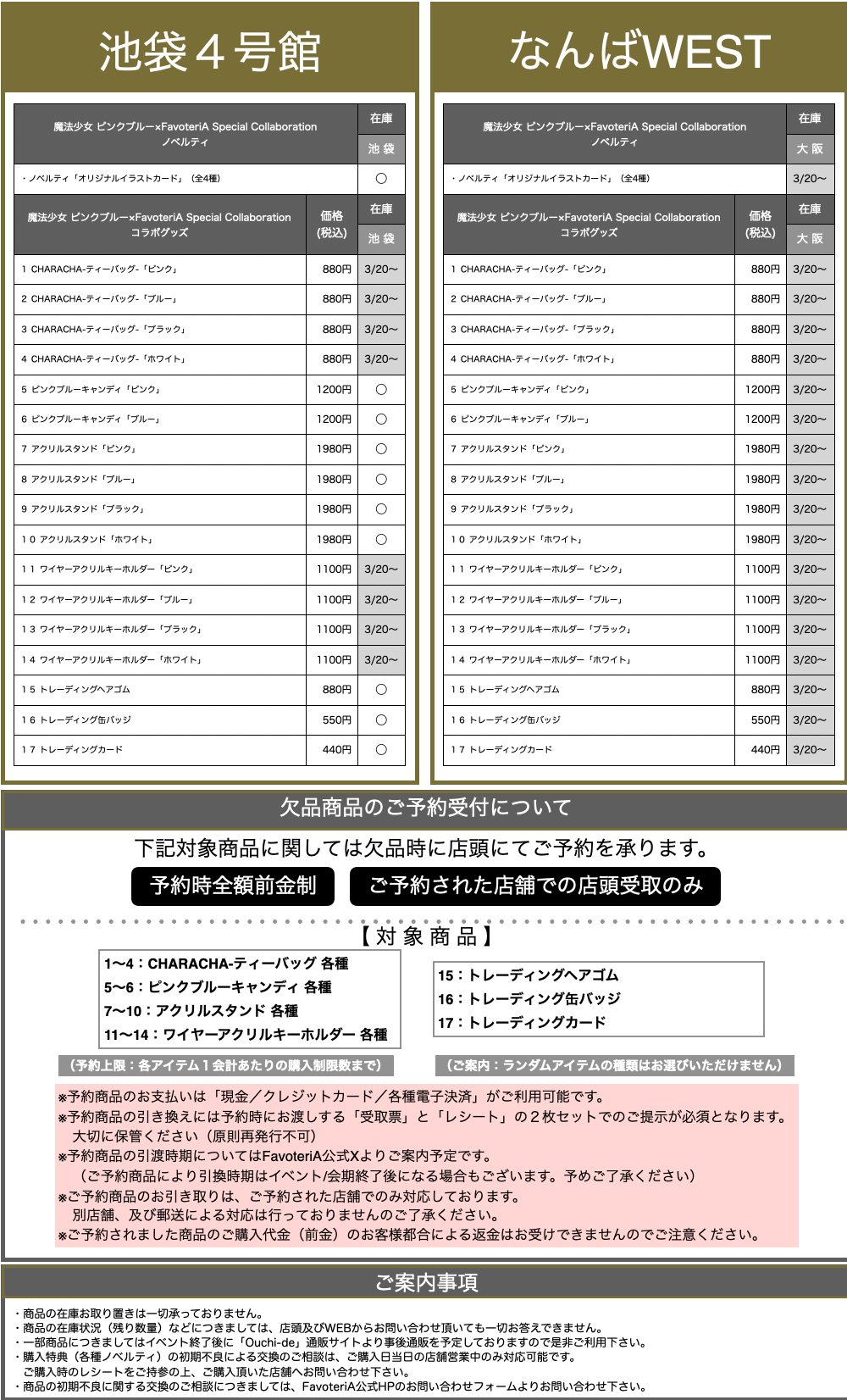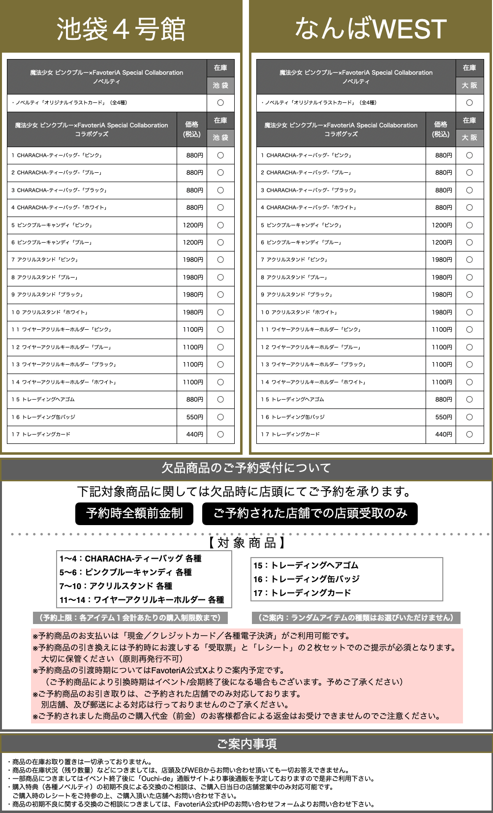 ・店舗で販売する取扱商品の在庫には限りがございます。売り切れの際はご容赦下さい。